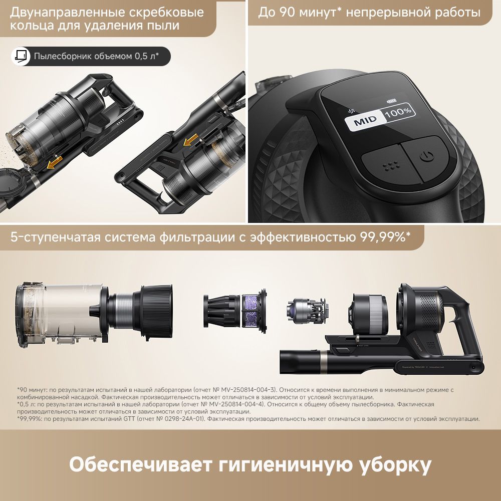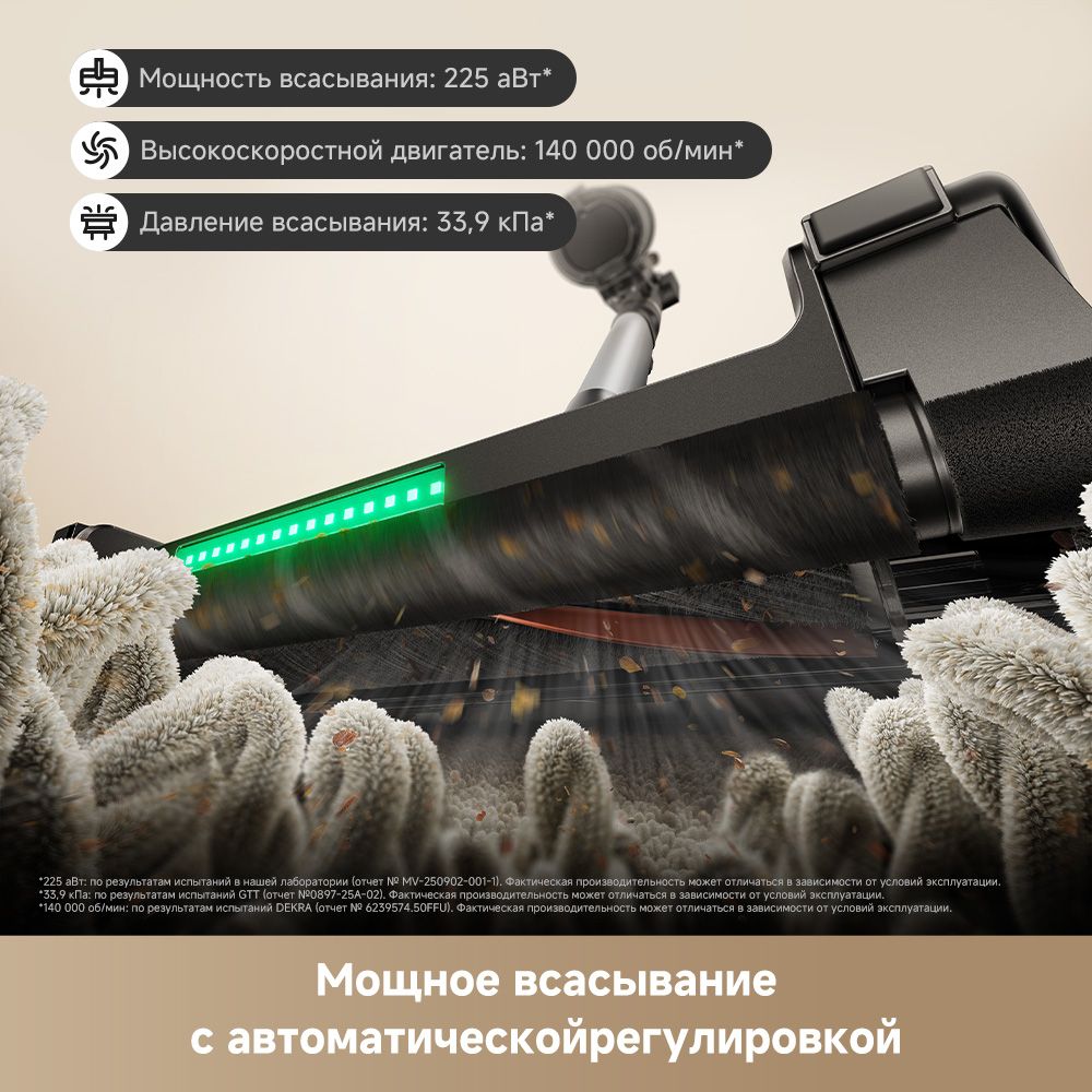 TROUVER G70 Detect — мощный беспроводной вертикальный пылесос с интеллектуальной системой уборки и автоматической регулировкой мощности. Оснащён роботизированной боковой щёткой для эффективной очистки вдоль стен и в углах, а также двойной щёткой для всех типов покрытий. Высокая мощность всасывания 225 AW, до 90 минут автономной работы и продвинутая 5-ступенчатая фильтрация обеспечивают глубокую и комфортную уборку без компромиссов.